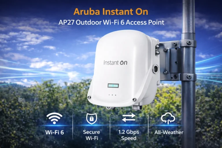 Typical Aruba Outdoor Access Point is the AP27. AP27 has the WiFi 6 and dual radio support. It also offers weatherproofing and durability making it an excellent option for commercial installation in outdoor environments.